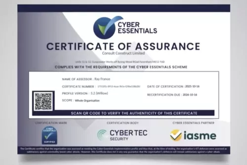 We are proud to announce that Consult Construct has successfully renewed its Cyber Essentials certification. This nationally recognised accreditation, backed by the UK Government and the National Cyber Security Centre (NCSC), underscores our unwavering commitment to cybersecurity and the protection of our digital infrastructure. For our clients and partners, this renewal serves as a clear indicator of the high standards we uphold in safeguarding sensitive information.
